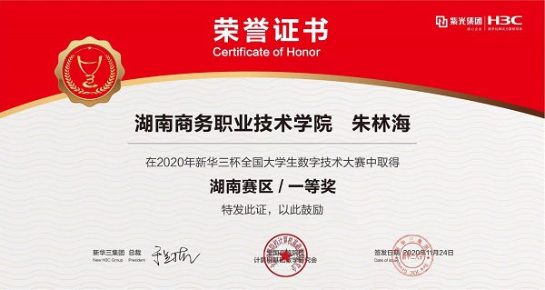 2020年“新华三杯”全国大学生数字技术大赛于11月27日公布预赛成绩,我院计算机网络技术专业9名学生在苏命峰老师指导下,奋勇拼搏、发挥出色,在全省六百多名参赛选手中脱颖而出。其中朱林海同学荣获一等奖,顺利进入全国总决赛。朱亚典、陈鹏、滕玮等3位同学分别荣获二等奖。毛剑煌、阳嘉诚、周剑棚、肖权、李松等5位同学分别荣获三等奖。