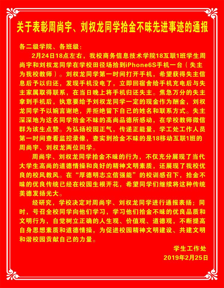 关于表彰周尚于、刘权龙同学拾金不昧先进事迹的通报
