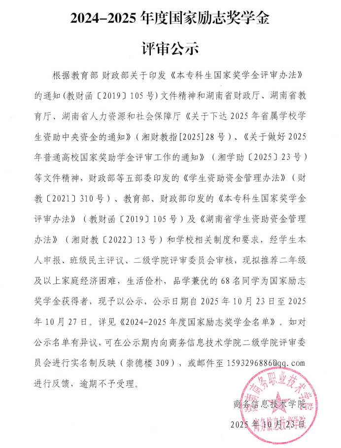 关于商务信息技术学院2025-2026学年 家庭经济困难学生认定结果的公示