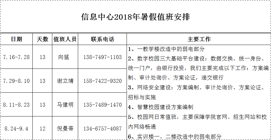 2018年暑假值班计划表