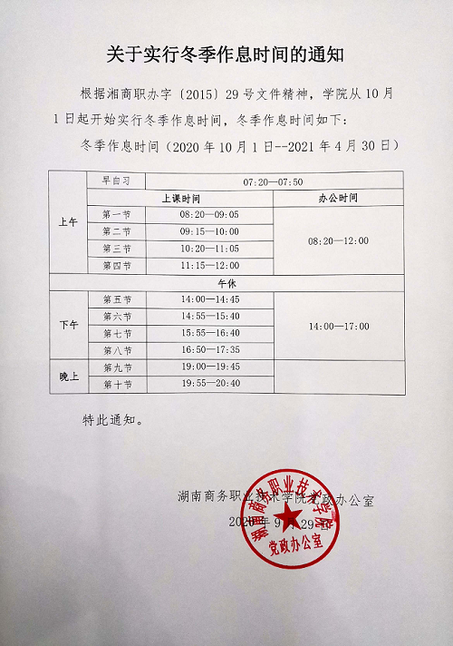 2020-2021学年冬季作息时间