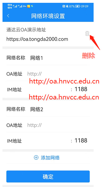 3、按下图所示对手机OA进行配置。OA服务器地址:http://oa.hnvcc.edu.cn
