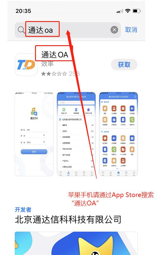 苹果手机通过App Store来下载(搜索“通达OA”)见下图: