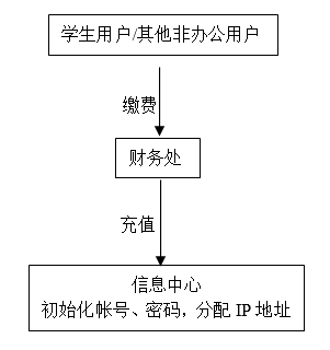(二) 学生用户或其他非办公用户需接入校园网时,均应按学院规定付费使用,并先到学院财务处缴纳网络使用费,然后携带身份证到信息中心办理开户手续,如果是学生用户还须携带学生证。具体按以下流程办理: