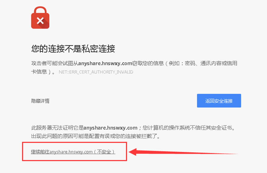 2.单击“继续前往anyshare.hnswxy.com(不安全)”,如下图所示: