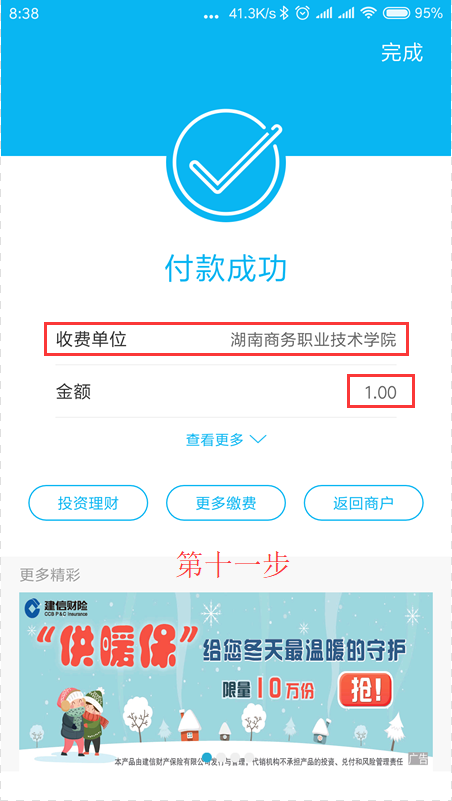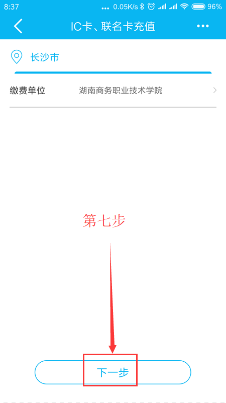 第十一步,再次确认收费单位为“湖南商务职业技术学院”和充值金额