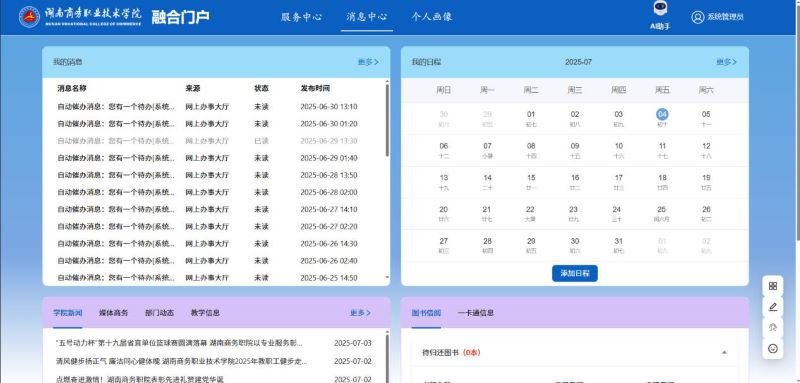 该文档主要内容为融合门户平台的用户端的快速入门和使用指导,旨在帮助用户快速掌握融合门户的使用方法。门户访问方式:进学校主页(https://www.hnvcc.edu.cn/),点击