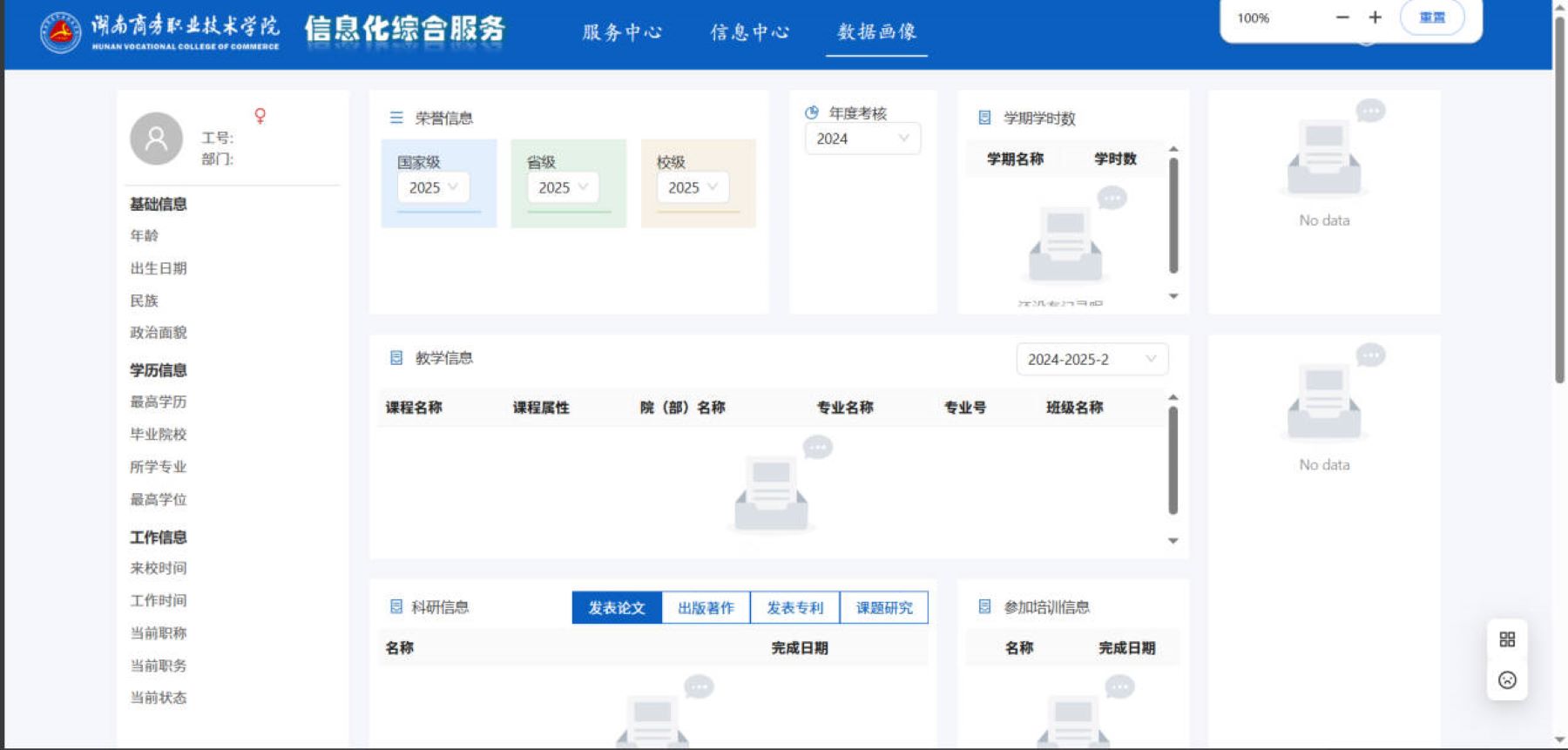 点击最上方菜单栏的“个人画像”部分,进入个人画像。该部分只负责展示个人数据信息,没有其他详细功能。用户可以查看自己的详细数据,具体数据项可以参考前端页面。