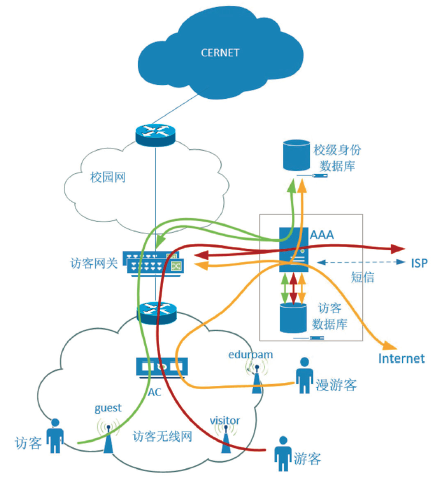 图2为无线访客系统架构示意图,无线访客系统针对三类来访人广播三个不同的SSID:Guest、Visior和Eduroam,来访人关联相应SSID后系统会全自动引导用户通过实名身份验证接入校园网,图中不同颜色线段示意了不同场景下的准入认证流程。