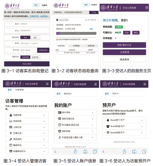 考虑到短期来访的校外客人对校园网使用方式不熟悉,因此无线访客系统对开户、认证、缴费、管理的每个操作环节都进行了充分研究,在界面布局、信息提示和操作引导方面进行了专业设计,对自助服务进行了极致优化,无论来访人还是受访人,无论专业IT人士还是非专业人士都可以无障碍地完成整个入网过程操作,而无需信息技术中心的介入,极大提升了用户体验。图3给出了部分用户使用界面,可以看出无线访客系统在用户体验方面进行了较为充分的考虑。