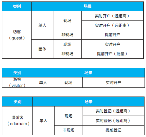 为了提高来访客人的入网体验,需要从多个维度考虑开户场景,并进行针对性设计。这些维度因素包括:来访人是单人还是团体、有无受访人接待、受访人是否在现场、客人来自国内还是国外、是否需要访问校内资源等,对来访人开户入网场景的基本总结见表1。