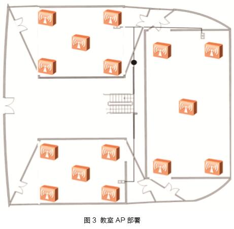 教室的无线终端主要为笔记本,WiFi模式主要为11g/n/ac。终端多支持5.8G,在该场景下选用放装型、11ac设备。如图3所示,在每间教室天花板上安装5个AP(前后各2个,中间1个)。
