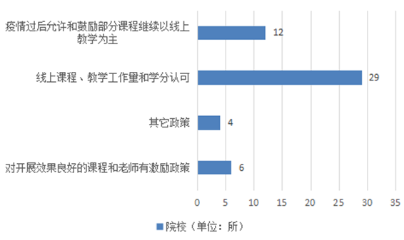 针对疫情期间教师开展的在线教学活动,大多数高校采用了线上课程、教学工作量、学分认可等多种政策支持措施,具体情况如图10所示。97%的高校实施了线上课程、教学工作量和学分认可政策支持措施;40%的高校将在疫情结束后允许和鼓励部分课程以线上教学为主;还有20%的高校还将对开展效果良好的课程和老师采取激励政策;另外有13%的高校选择其他政策措施。
