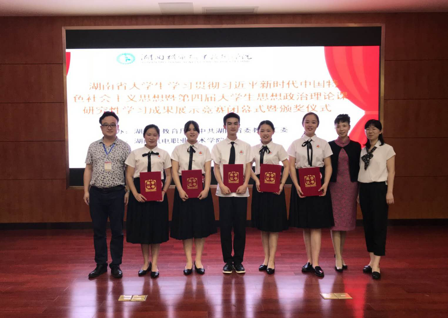 在5月27日结束的湖南省大学生学习贯彻习近平新时代中国特色社会主义思想暨第四届大学生思想政治理论课研究性学习成果展示竞赛决赛中,由思政课部邓艳君、高莉和肖彬老师指导的研究性学习小组——17级市场营销1班何江瑶、肖剑、曾睿琪、黄琳欢、易凤琴,以作品《习近平知青岁月对大学生成长成才的启示研究》,获得高职高专组一等奖第一名。