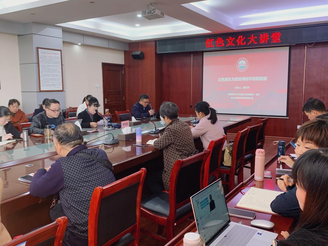 为深入学习贯彻习近平新时代中国特色社会主义思想,进一步提升学校思想政治理论课教师的政治素养和能力素质,12月5日下午,马克思主义学院在崇德楼523举行“红色文化大讲堂”,邀请湖南农业大学马克思主义学院院长胡艺华教授开展题为《红色音乐为思想政治教育创新赋能》的学术讲座,讲座由马克思主义学院院长邓艳君教授主持,全体教师参加。