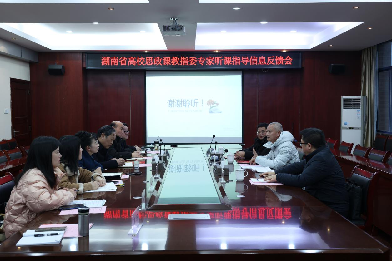 12月20日下午,湖南省高校思政课教指委龙兵、谭吉华、胡艺华三位专家前来我校对思想政治理论课开展听课指导。专家组听取了马克思主义学院王智慧、李双根、王琛扬老师讲授的思政实践、毛泽东思想与中国特色社会主义理论体系概论、形势与政策等课程,一线检验思政课教学成效。听课环节结束后,在崇德楼523会议室召开了信息反馈会,学校党委书记周忠新、副校长易兰华、马克思主义学院院长邓艳君以及副院长肖彬、全体思政课教研室主任参加会议。