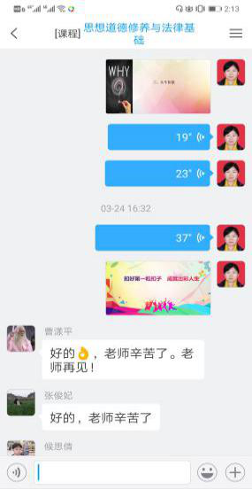 在平台上,每位教师以班级为单位进入班课,通过签到、课堂表现、头脑风暴、投票问卷、课程测验、成绩管理等手段展开线上交流。为了能够好地实时监督学习效果,还建立了学生微信群、QQ群等辅助线上教学和班级管理,学生都能随时与老师直接沟通。师生间及时对话、沟通和交流,避免了信息失真和任务消解。同时,也起到了凝聚共识和传递正能量的作用,让每位学生真切感受到“课堂就在家里,老师就在身边”。