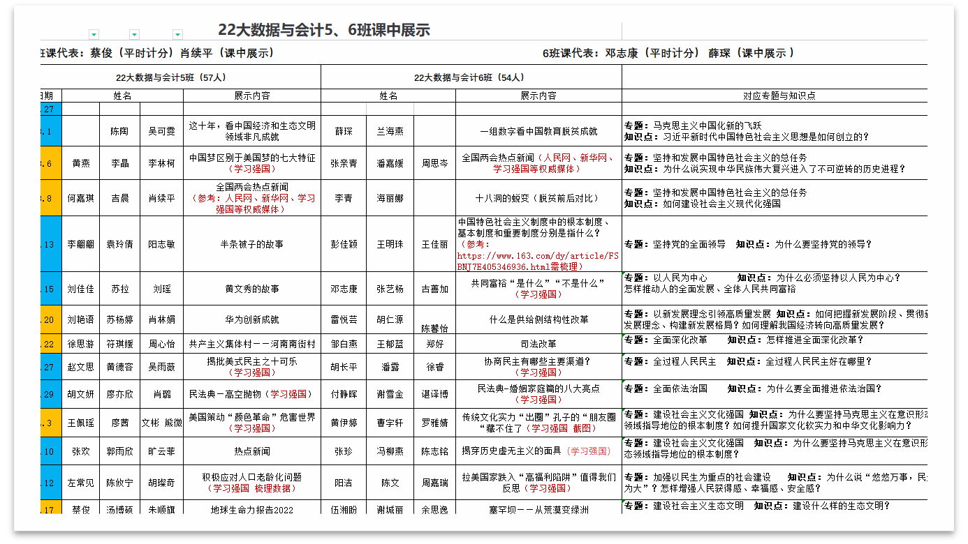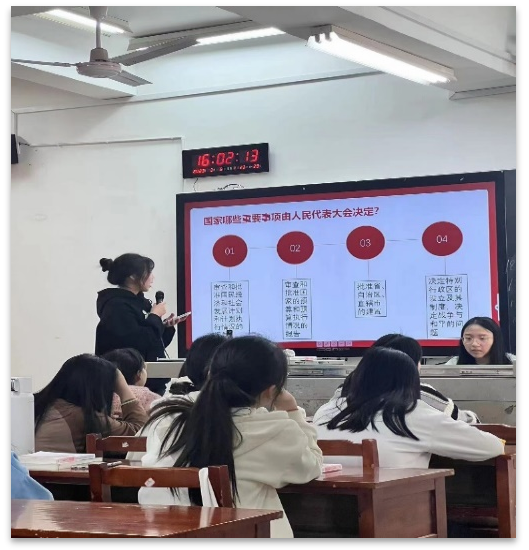 课内实践主要采用小组展示、课前新闻播报、翻转课堂等形式,极大地调动了学生学习的积极性,学生思考认真、发言踊跃,大大提升了思政课的获得感。
