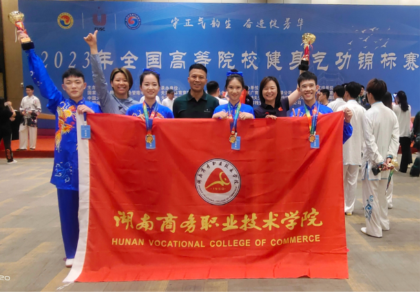 2023年全国高等院校健身气功锦标赛在天津举行。经过数天的激烈角逐,湖南商务职业技术学院代表队获得乙组集体赛八段锦一等奖、