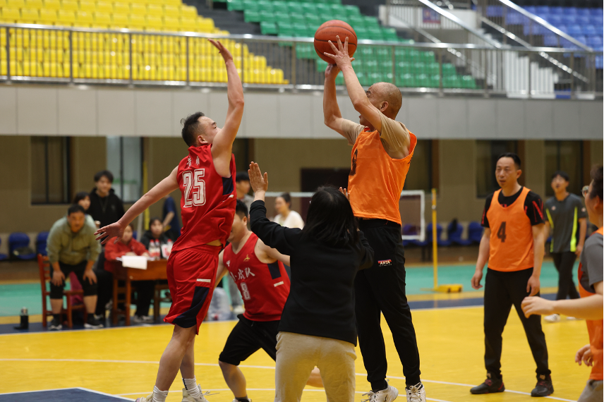 球场上,老师们身着各色队服,身体随着篮球的运动而灵活跃动,时而快速冲刺,时而猛然跳跃,你来我往间现场气氛热烈。技巧转身、突破变向、跳投球……鞋与地板摩擦发出的声音,篮球撞击篮筐的声音,构成了一首动人的篮球交响曲。女老师的表现丝毫不逊于男老师,她们以优美的身姿和精准的投篮技艺,诠释了篮球运动的魅力与激情,充分展示了教师们斗志昂扬、齐心协力的精神面貌。