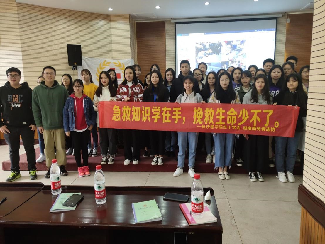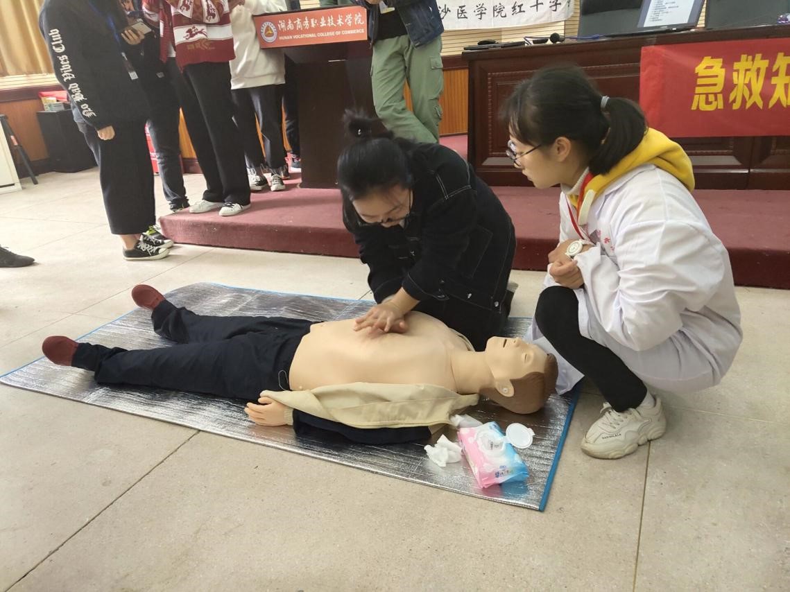 讲座首先由长沙医学院红十字会的培训人员对CPR进行理论讲述,让学生对CPR有了初步了解,同时强调抢救中珍贵的“黄金四分钟”的重要性以及注意事项。随后由长沙医学院红十字会培训人员进行了假人演练,并且请学生参与实操。在培训人员的悉心指导下同学们详细了解了救助过程中的流程。