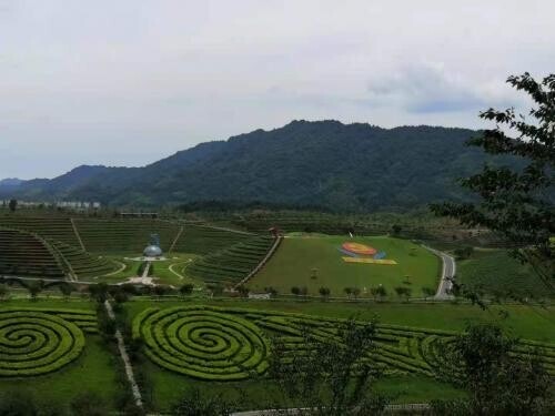 盛夏时节的茶乡花海,郁郁葱葱,荷花池中,片片翠玉,绿浪漪漪,景区内98座小山头上,1000亩茶树萌发生长,日本芝樱、德国鸢尾、虞美人、三色堇、映山红……各类花卉争红斗艳。整个景区犹如被精雕细琢的艺术品。