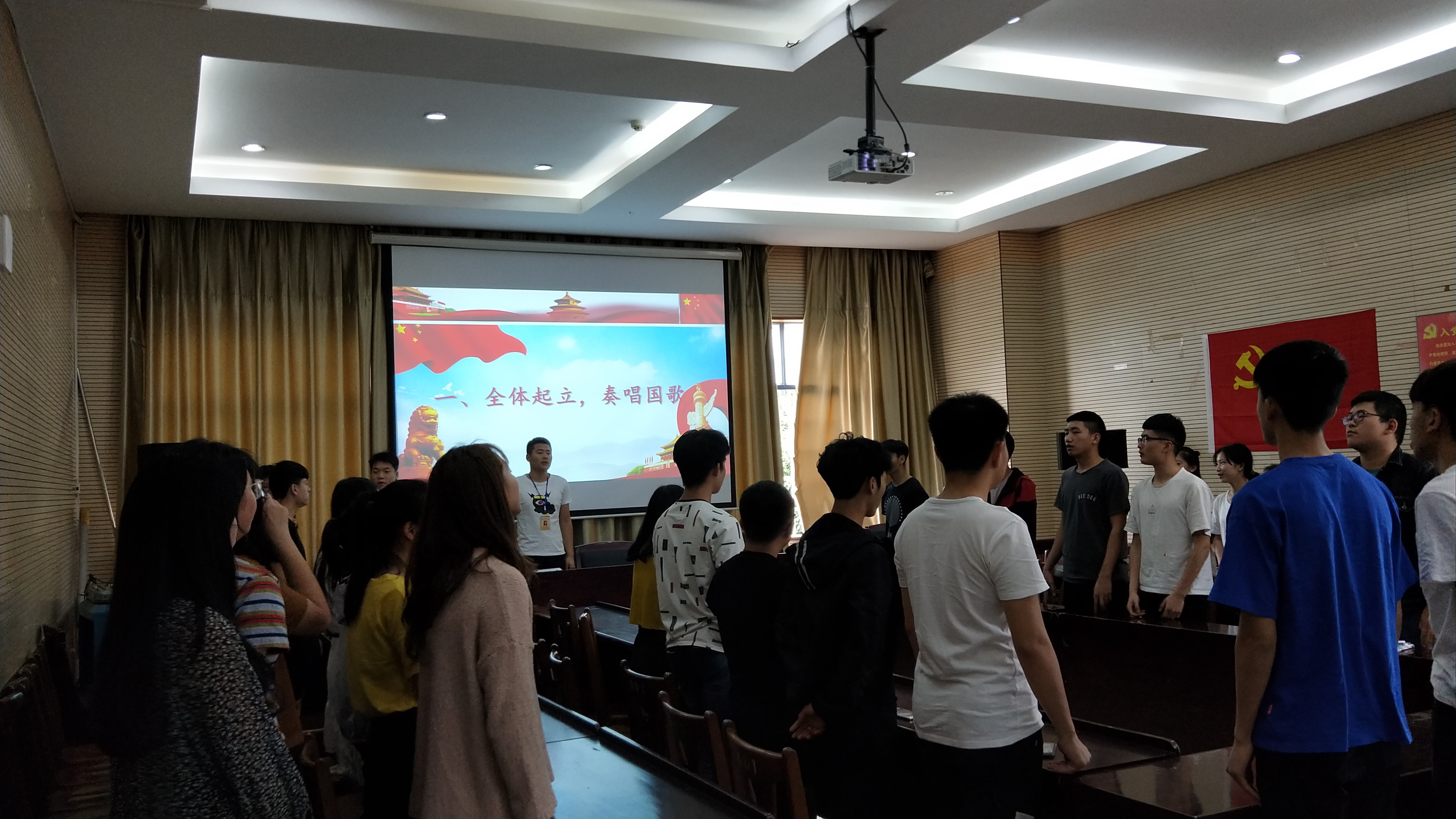 本次入团宣誓仪式主要有四项议程,第一项:全体起立,奏唱国歌;第二项:主持人宣布入团人员名单;第三项:主持人带领新团员宣誓;第四项:院团学会主席兼副书记寻盈丰讲话。