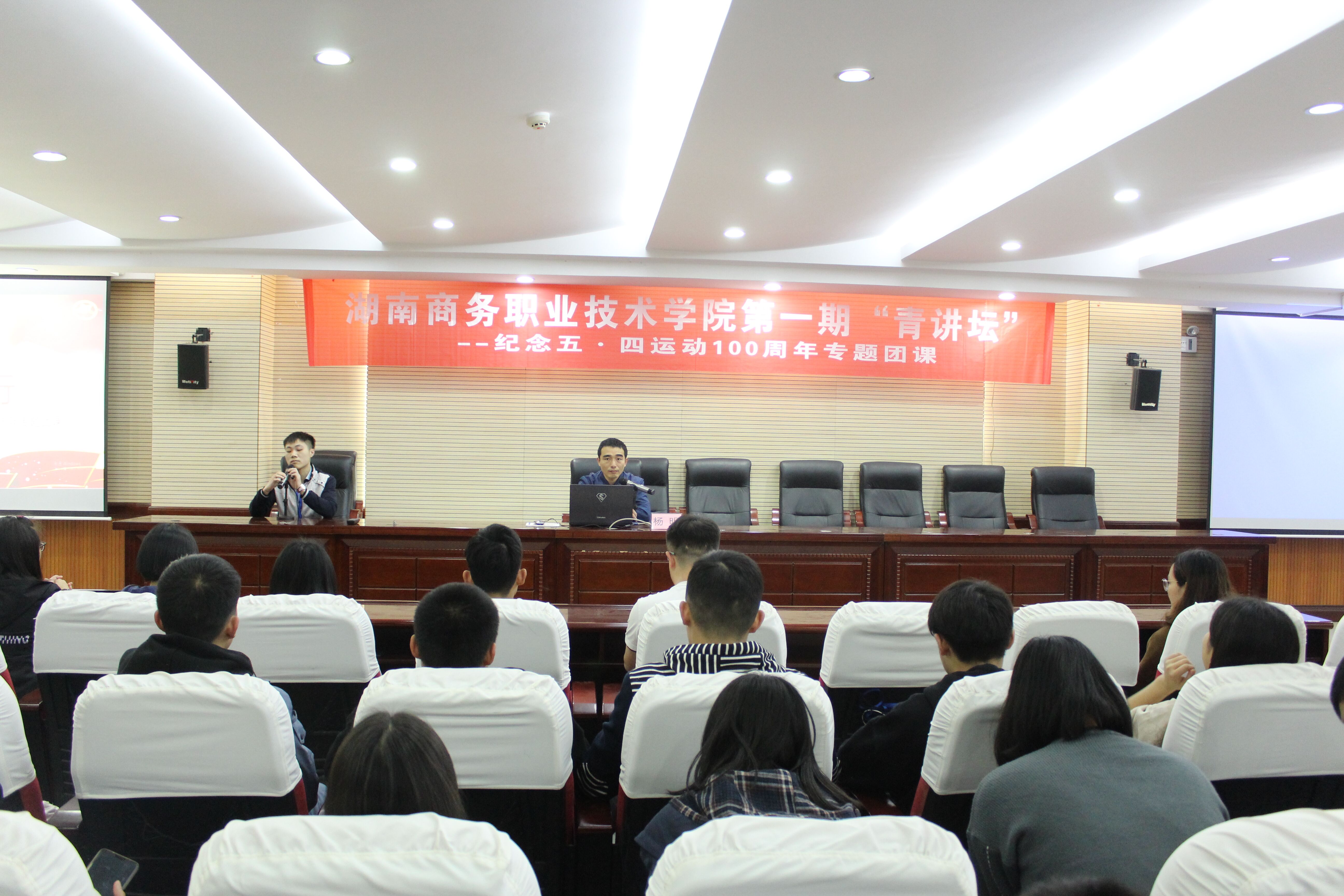 本网讯(通讯员:校团委宣传部王萌)2019年4月10日,我校团委在六楼会议室举办了第一届青讲坛活动,由校团委杨明书记主讲本期为“纪念五四运动100周年专题团课”的主题,参加人员有校团委黄郁娇老师、校团学会学生干部以及二级学院团学分会学生干部,校宣传部部长刘福主持。