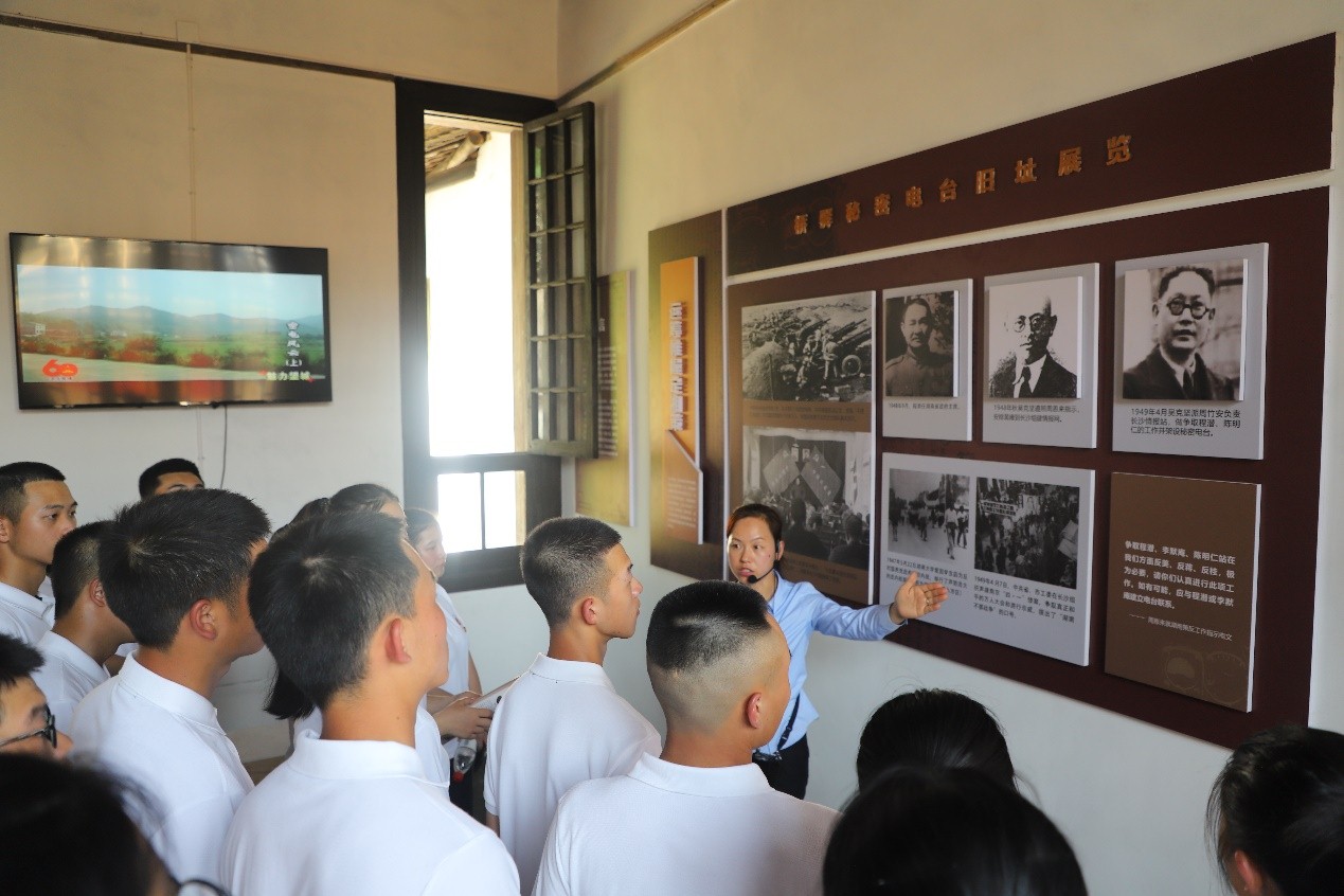 随后师生们到达了湖南和平解放秘密电台工作站旧址,它是一座四合院建筑,位于长沙市望城区桥驿镇洪家村付家组,是湖南和平起义时中共与国民党湖南当局联络所设置的秘密电台。后山有个防空洞是为躲避日军入侵而修建,湖南和平解放秘密电台在紧急情况下就藏匿于此,洞口直立约一人高,洞长3米,周围树木繁茂,位置十分隐蔽,不易发现。湖南和平解放秘密电台旧址对研究湖南和平解放具有重要的历史价值,商务职院的师生们在这里重温了庄严的入团宣誓,铿锵有力的誓言响彻全场。