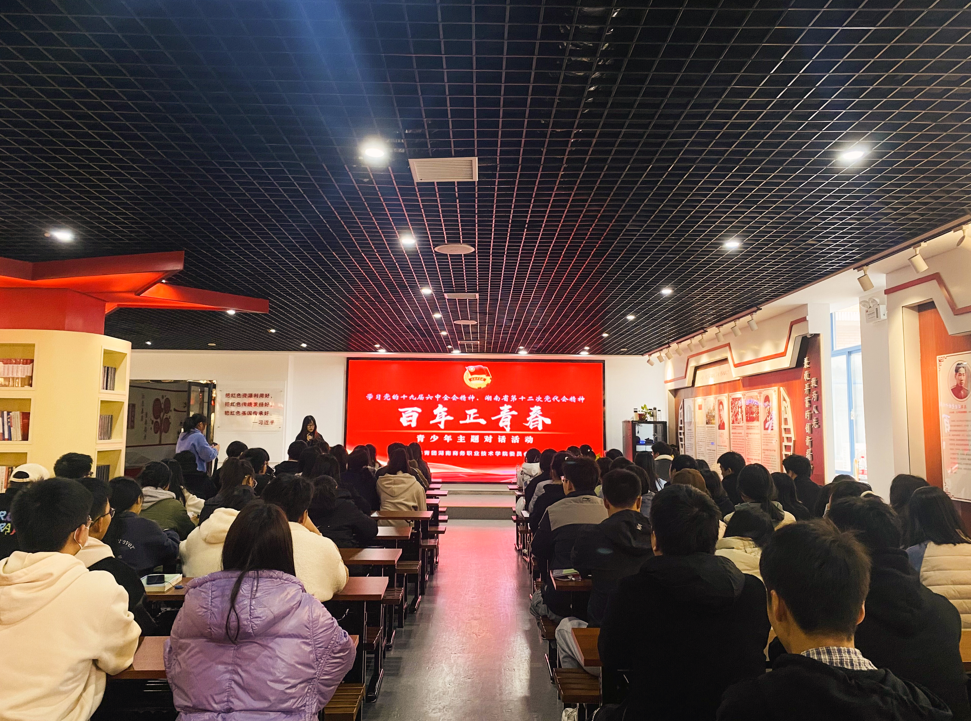本网讯(通讯员:校宣传部干事彭琪)为学习宣传贯彻党的十九届六中全会精神和中共湖南省第十二次代表大会精神,进一步加强青年学生思想政治教育,提高思想道德素质,学院团委于12月14日下午2点30在办公楼思政实践教育中心举办“百年正青春”青少年主题对话活动,与会人员主要包括学院团委罗佳玲副书记及校团学会全体人员,团委学生副书记谢雨欣同学主持。