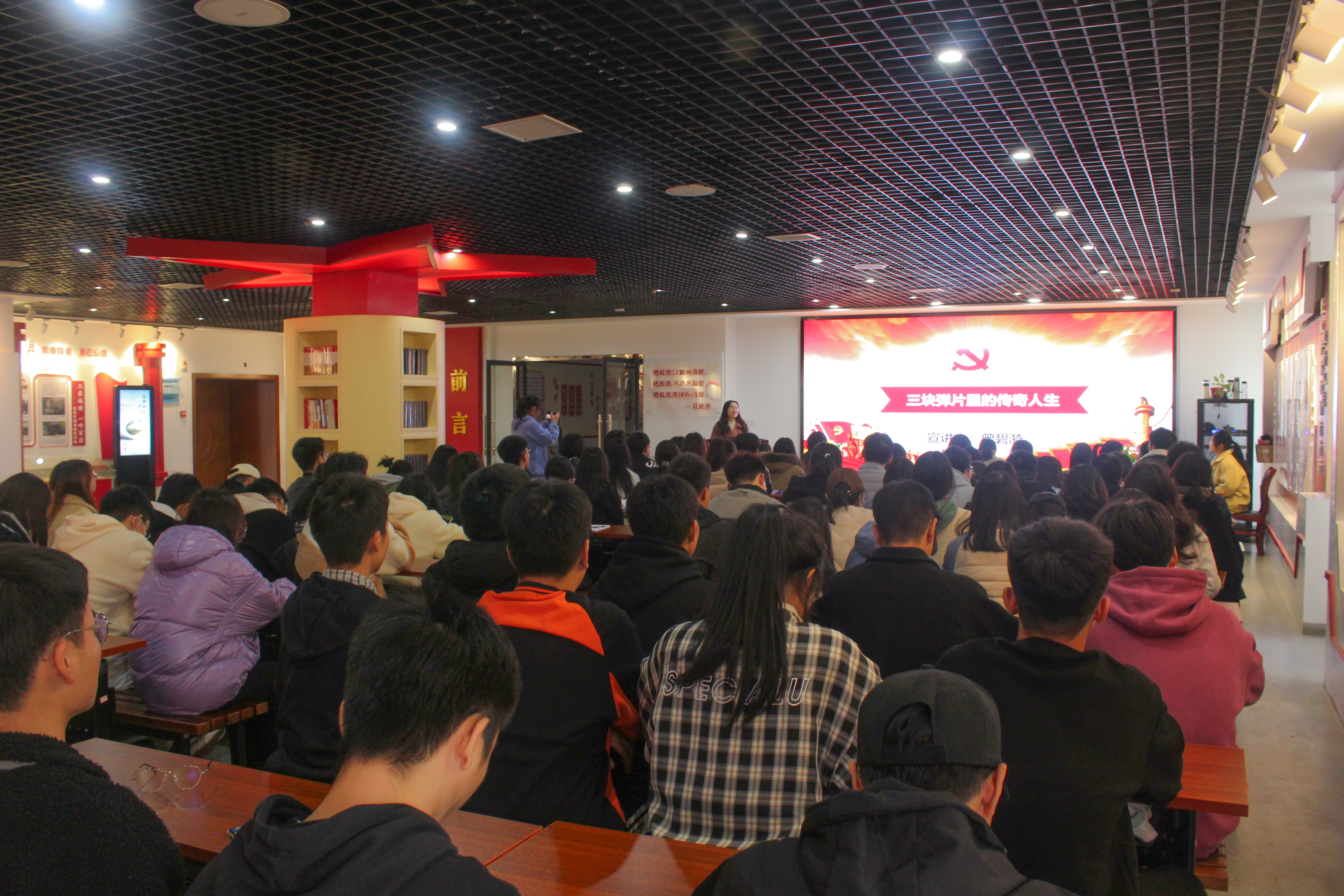 随后集体观看主题宣传片《你的故事》,领略中共党员的优良品质,马克思主义学院的李志平、孔霞、汤艺峰、曾碧漪四位老师先后进行了红色故事宣讲,通过典型的红色故事讲述中共党员的优良品质、中国共产党的艰苦历程。紧接着学生代表以合唱的方式表演了红色主题节目《国际歌》,铿锵有力的歌声感染了在场所有人,最后在浓郁的氛围中全体起立奏唱团歌。