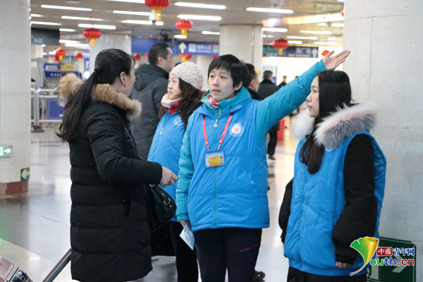 北京西站,青年志愿者为旅客进行指引服务。中国青年网记者 李川 摄