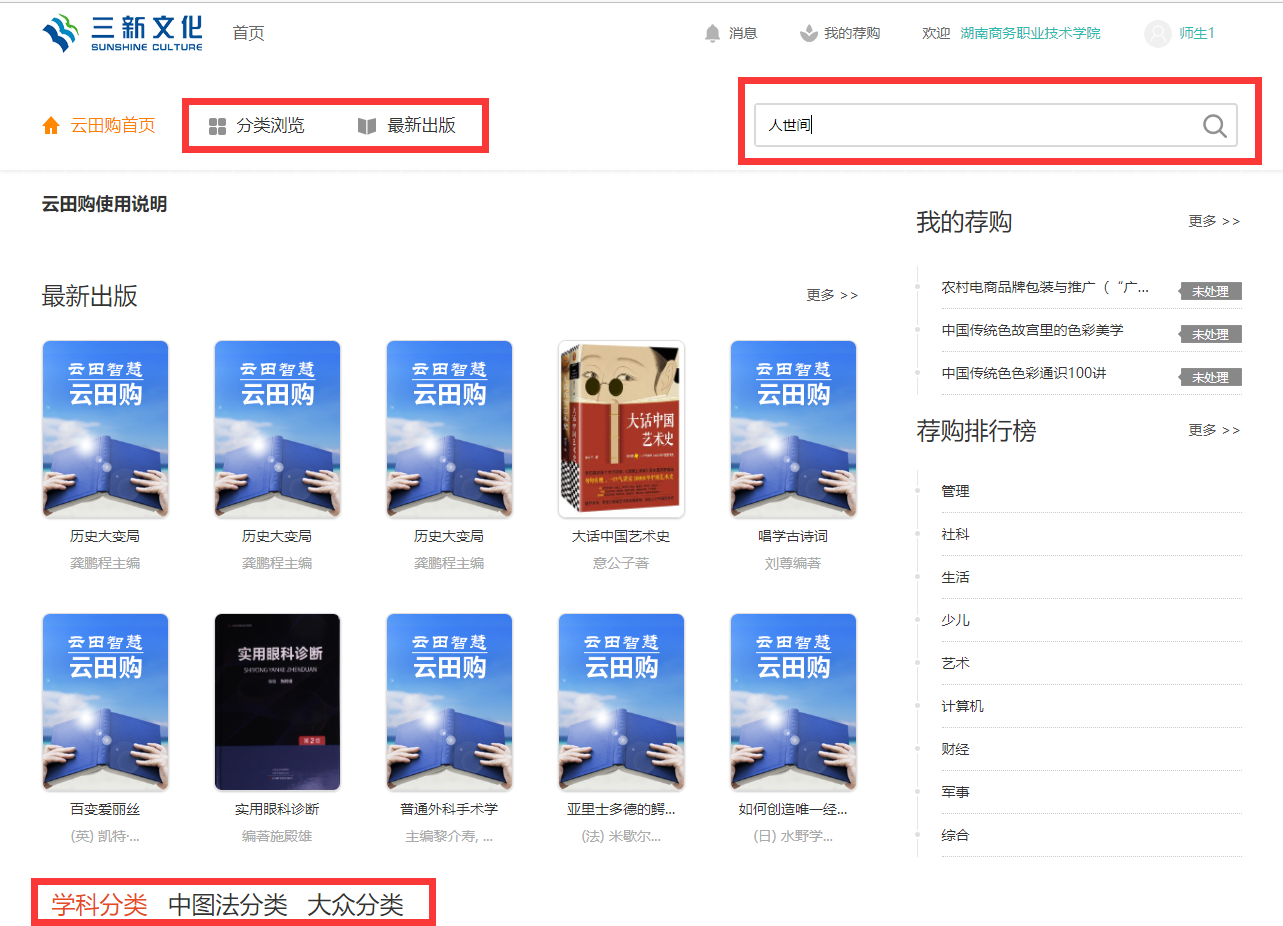 除基础中图分类外、更有适宜高校图书馆采选的学科分类展示图书;您可以根据需要点击分类浏览进入书目荐购界面,也可以直接输入书名、作者、出版社等信息进行搜索。