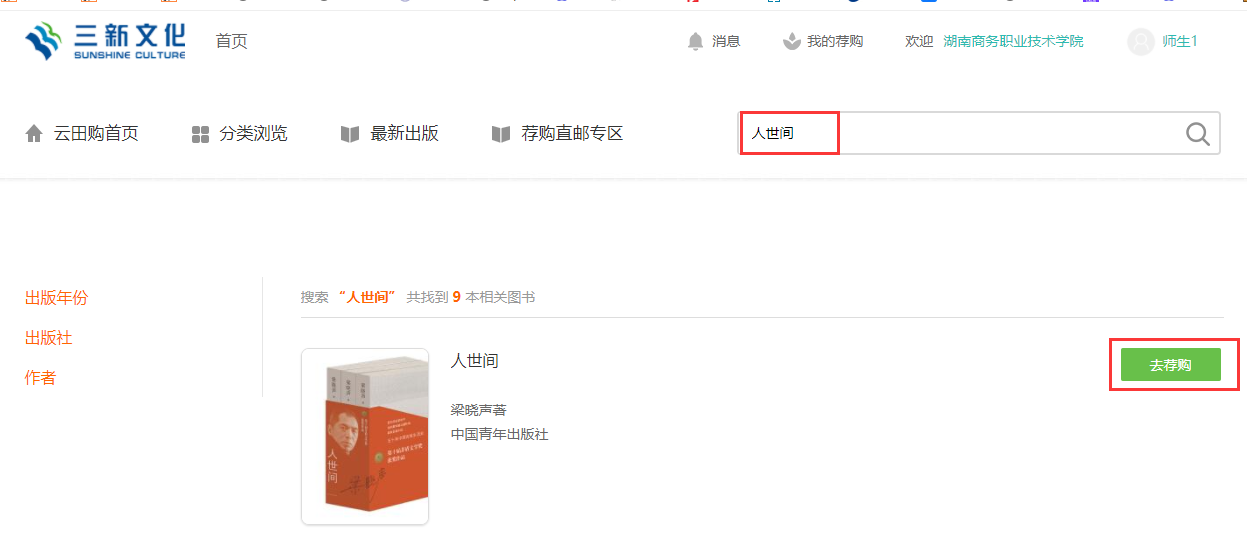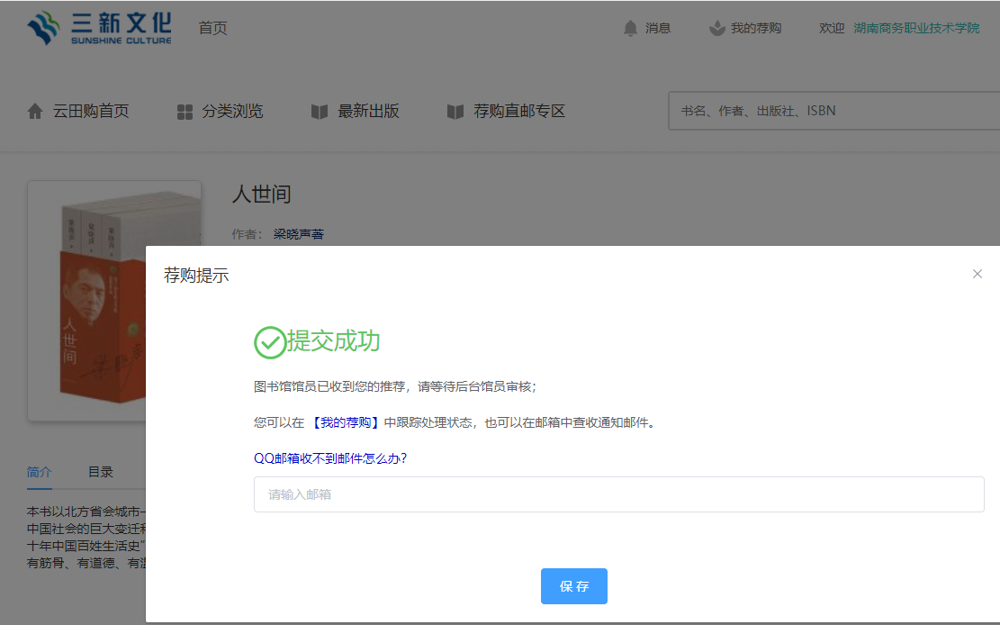点击您心仪图书“去荐购”,在图书介绍页点击“荐购”,提交成功后点击“保存”。