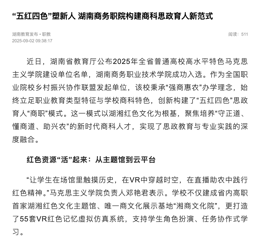 湖南教育发布报道——“五红四色”塑新人 湖南商务职院构建商科思政育人新范式