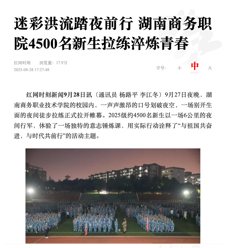 红网报道——迷彩洪流踏夜前行 湖南商务职院4500名新生拉练淬炼青春