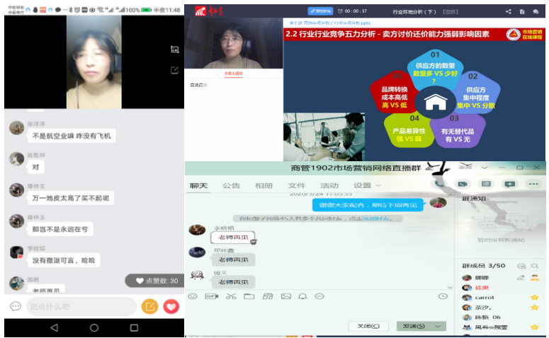 防疫期间,如何保障线上教学效果,是《市场营销实务》课程教学团队要解决的最根本的问题。为此,王娜玲带领团队成员尝试了超星直播、学习通直播以及QQ直播、同步课堂、超星录播等各种平台、各种方式之后,对学生开展调查,再结合教师教学过程中的感受,经反复研讨后,决定采用“课前录播视频自主学习+课中直播授课辅导答疑+课后思考讨论巩固复习”教学模式组织线上教学。