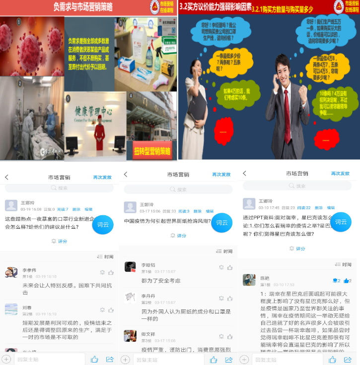 精心挑选教学内容,疫情案例无痕植入。在教学资料的准备过程中,教学团队成员借助各类营销公众号等学习平台搜集大量疫情相关的企业案例,在各知识点中有机融入。如在“需求状态与营销任务”一节授课内容中,以“病毒感染医疗需求”为例说明负需求概念以及应对措施学生深有感触,在“行业环境分析”内容中用“口罩设备购进”模拟活动来解释买方讨价还价能力就比较容易被学生理解。课后在学习通讨论区中通过播放“转行做口罩暴富”、 “中国疫情引起世界厕纸抢购风潮”、“瑞幸咖啡千里送无人咖啡机” 等新闻来设计与知识点及思政相关思考题引导同学们参与讨论,在知识拓展栏目录制了“2020年新冠疫情后的行业机会”等疫情主题的营销讲座拓宽学生视野同时提高学生职业敏锐度。
