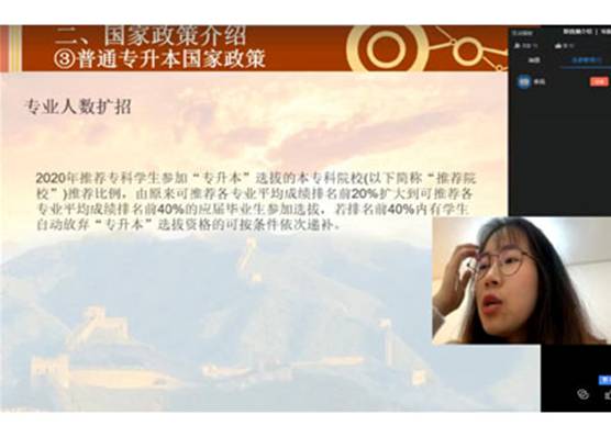 此次交流会分为电商移商专业学习交流会、国商专业学习交流会和电子商务技术专业学习交流会三个直播间开展。会上,主持人黄书敏以PPT形式向同学们讲解专升本的相关知识,让同学们对专升本有初步的了解。会议中,直播间的同学们积极提出问题,各专业的学长学姐们也热情的给与了答复。随后,16级设计1班高宏华、16级电商2班曾盛辉、16级国贸1班李扬以风趣幽默的形式向同学们分享了自己从备考到考前的专升本复习应考经验,并希望在场学生认真备考,珍惜此次学习机会。他们恳切的言辞、用心的分享,赢得了在场学生们一致好评。