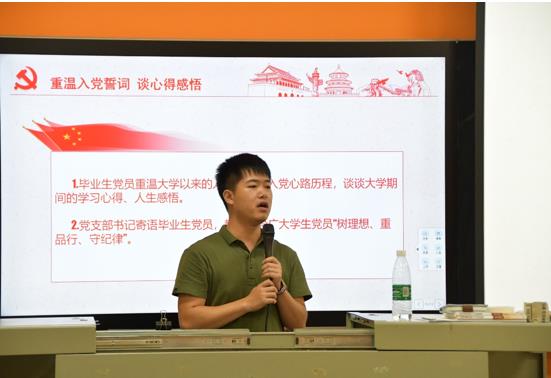 会议先后学习了《新形势下如何做合格党员》、《共产党员要在疫情防控中发挥先锋模范作用》等文件和视频精神,重温了入党誓词。毕业生党员陈家升还分享了大学期间的竞赛感悟。他表示,非常感谢商务职院给了我很好的条件和资源去代表整个湖南省参加沙盘的国赛,一路上很不容易,有付出也终会有回报,感谢当时没有轻言放弃的自己,同时感谢老师们的谆谆教导和关怀。语毕,会场里爆发出雷鸣般的掌声。