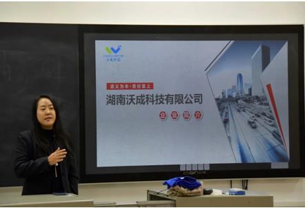 随后,校企代表邓美香给大家讲述了湖南沃成科技有限公司的基本情况,并对企业文化及相关部门的介绍,整个交流会现场热情洋溢,气氛轻松活跃。