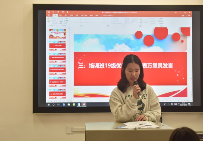 此次会议在于总结为期两周的培训班课程,表彰此次课程的优秀学生,鼓励和赞扬学员们认真学习以及积极参与活动的精神。会议中,20级优秀学员代表田宇健发言,他真诚地同大家分享了自己对“团“的理解以及在此次培训课的收获。同时,19级优秀学员代表万慧灵对本次培训课程做了深刻总结,并呼吁大家在今后的工作中能不断挑战自己、提高自己,成为一名优秀的学生干部。最后卢一慧老师作总结发言,刘灿勋老师为PPT演讲比赛获奖者以及团建活动获奖者进行表彰和分发奖品。
