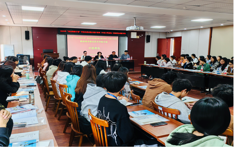 为深入学习党的二十大精神和全国两会精神,贯彻落实习近平总书记关于高校毕业生就业创业工作重要指示批示及党中央、国务院“稳就业”“保就业”的决策部署,进一步提高毕业生的综合素养及就业能力。2023年10月22日上午,学院在第二教学楼201会议室举行2023年“宏志助航计划”毕业生就业能力提升培训(中南大学基地)湖南商务职业技术学院专场开班仪式。学院党委委员、副院长禹明华,招生就业处处长刘芳芳、中南大学就业指导中心副主任陈晚云、就业创业教研室主任陈启实出席会议。招生就业处副处长陈慧军、刘强老师以及80名受训学生参加开班仪式。开班仪式由刘芳芳主持。