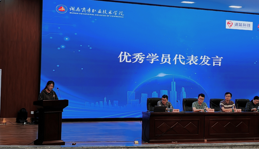 黄宇峰详细回顾了校企合作实训项目的开展情况,对学员们的表现给予了高度评价,并宣布了优秀学员名单。在热烈的掌声中,皮卫、邓群、谢林勇和黄宇峰共同为优秀学员颁发了荣誉证书和奖品。22级人工智能1班彭开琪同学作为优秀学员分享了自己在实训项目中的学习经历与收获,表达了对学校和企业的感激之情,并鼓励同学们积极参与企业实践,努力提升专业技能,为未来的职业生涯打下坚实的基础。