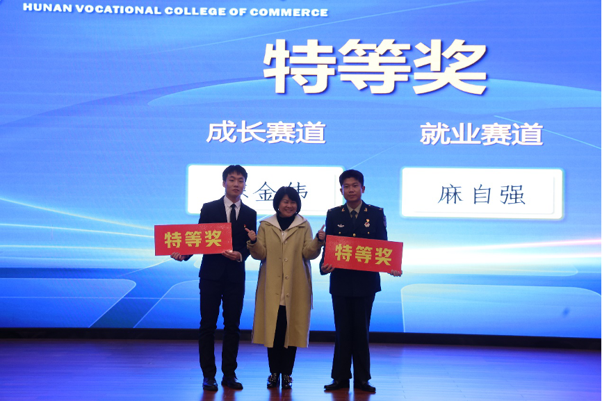 根据专家组的最终评审结果,成长赛道陈金伟荣获特等奖;黎诺萱、余芳获一等奖;陈雪琪、唐佳怡、陈玲、伍超琦得二等奖。就业赛道麻自强荣获特等奖;舒珊、周可获一等奖;郭宝琳、陈琪凤、易天然、黄诗雨得二等奖。