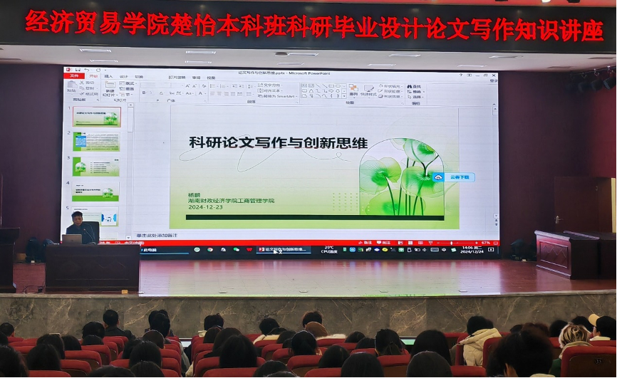 2024年12月24日,经济贸易学院在崇理楼多功能报告厅举行科研能力与论文写作专题讲座,楚怡工匠计划市场营销本科2023级、2024级全体同学参加。讲座由湖南财政经济学院工商管理学院院长杨鹏博士、教授主讲,经济贸易学院禹海慧教授主持。