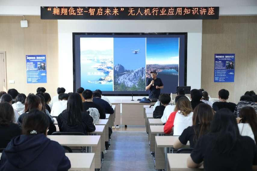 当日下午四点,在学院博思楼学术报告厅,湖南翼启飞无人机学院技术总监喻帅宇以《低空经济时代的无人机产业生态》为题,通过详实的数据分析和丰富的案例展示,系统解读了无人机在智慧农业、应急救援、地理测绘等八大领域的创新应用。