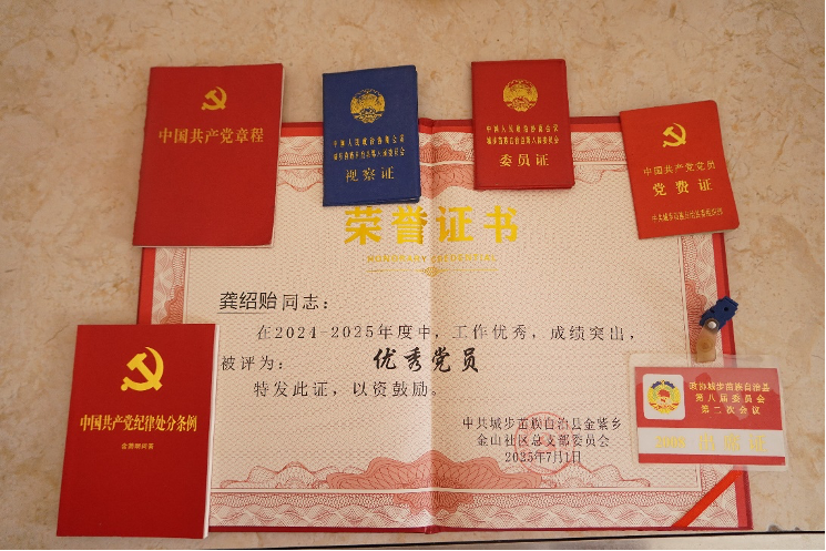 “当年我们挎着帆布包、穿着解放鞋,走遍村里的沟沟坎坎。”老党员曾秀枚一边展示珍藏的党章和泛黄的“优秀共产党员”证书,一边动情回忆,“现在条件好了,但艰苦奋斗的精神永远不能丢!”在驻村第一书记刘明浩陪同下,志愿服务队走访慰问了6位平均党龄超50年的老党员。这些扎根基层数十载的老党员,用质朴的话语和一生坚守,诠释着共产党人的精神品格。