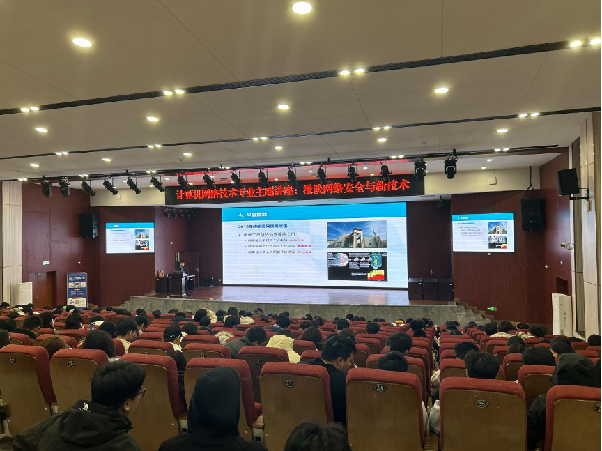 2025年10月21日晚,我院特邀国防科技大学任江春博士莅临崇理楼报告厅,为计算机网络技术专业全体师生带来了一场主题为“漫谈网络安全与新技术”的精彩专题讲座。讲座现场气氛热烈,学术探讨氛围浓厚,师生互动紧密,热情高涨。