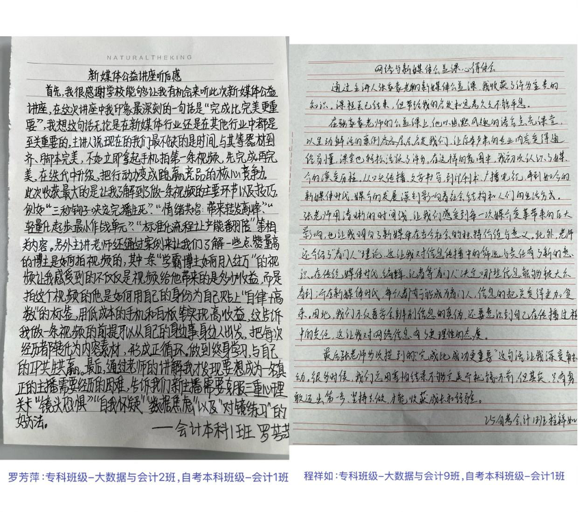 课堂上,学生们专注记录课程核心要点,完成了详实的课堂笔记,不仅对新媒体领域形成了全新认知,更系统掌握了相关实操思路与方法;课后,不少学生进一步梳理所学,精心撰写了手写心得。热烈有序的课堂氛围让学习不再是单向输入,而是双向的知识碰撞与思维启发。本次课程虽为期有限,但为学生深入探索新媒体领域奠定了坚实基础,成为技能提升之路的良好开端。